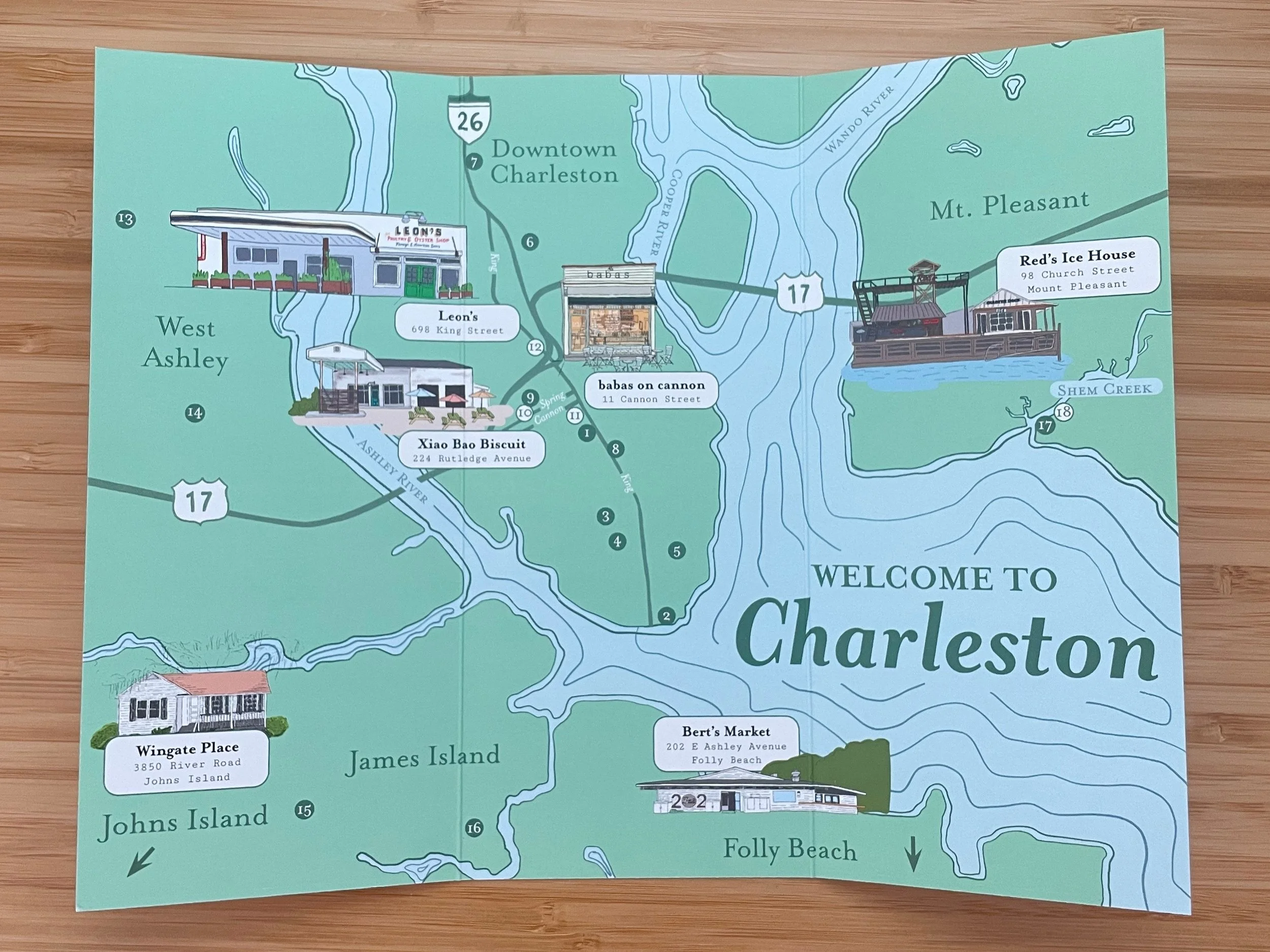 The map opens to information about their wedding weekend, with a note on the back from the bride and groom. The inside features a full-color map of the Charleston area with a full list of places to eat, drink and hang out throughout the Charleston area.